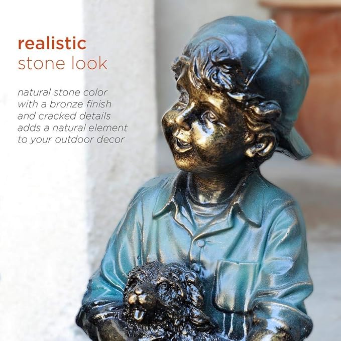 - OUTDOOR STATUE: Whimsical girl and boy sitting on a bench while holding their dog statue looks great in your yard or garden, or placed on your deck or porch