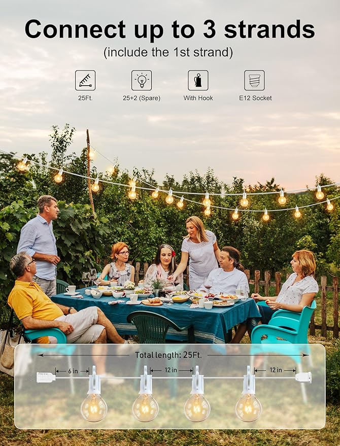 - Dimmable compatible and energy saving: G40 outside string light come with 25 glass bulbs and 2 spare bulbs. 1.5 inch light bulbs have E12 or C7 candelabra socket base, 5W per bulb, warm white dimmable string light help you to save more electricity bid