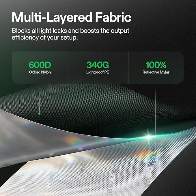 - Stand Sturdy & Extra-thick Materials: The indoor tent is supported with strong metal poles, top bars, and tool-free corner connectors to lock the structure securely in place; The top hanging bar can hold up to 100 lbs. each that can satisfy your different equip requirements; The premium 340 g high-density fabric is waterproof, tear-resistant and double-stitched for great light blockage, while the inside lining is designed with PE material and mylar walls that are safer for your plants