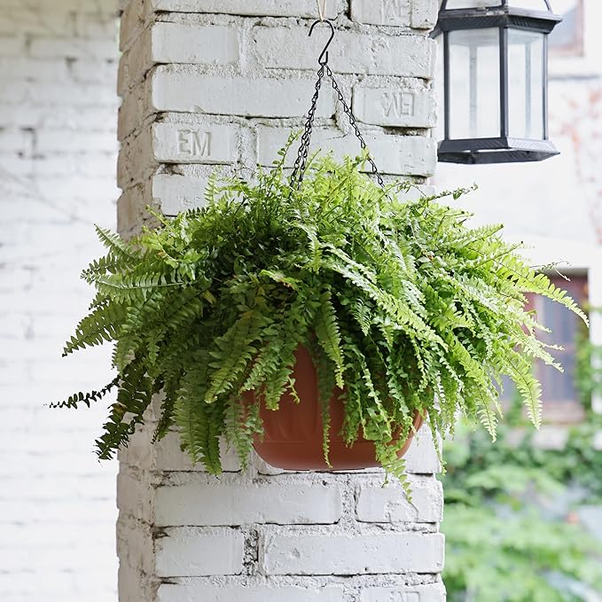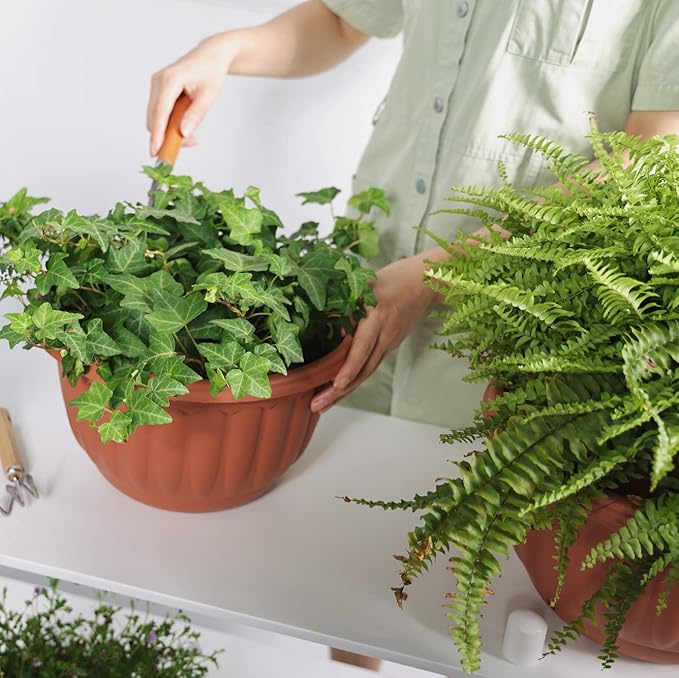 YIKUSH Hanging Planter for Indoor and Outdoor Plants 2 Pack 12 inch Flower Pot Plastic Plant Pot with Drainage Hole and Absorbing Tray(Terracotta)