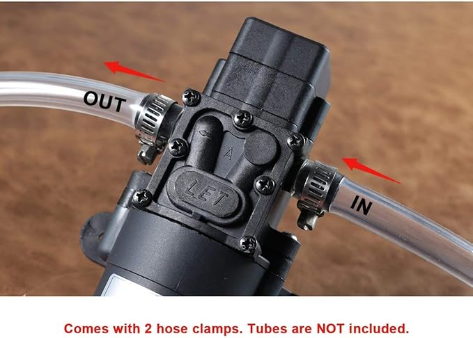 - Inlet and Outlet: 3/8-inch hose barb ports. Vertical Suction Lift: 6.6ft (2m). CUT-OFF Pressure: Default 80-85PSI. It doesn't mean 4.5L/min jet at 100PSI. Comes with 2 tube clamps. WARNINGS: DC 12V Power supply ONLY!! No AC power. Voltage OVER 14V can burn the motor.