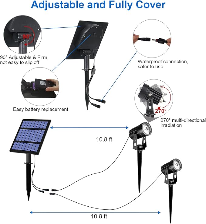 - 【 Adjustable & Fully Cover】270° Adjustable dual headlight with a separate solar panel, and the line between the landscape lights and the solar panel is 10.8 feet long, it's not only able to illuminate your desired spot but also to get optimum sun exposure. Extra 5m extension cable available: Please search ASIN B095314R6J.