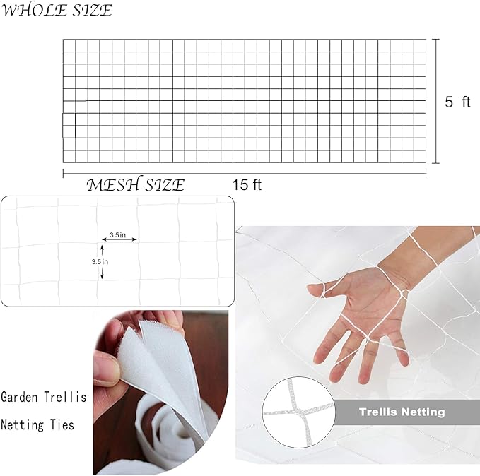 - 5.【EASY TO INSTALL】plant trellis net,Simply wrap and tie the netting around any stable structure or support, For ease of use, Garden Trellis Netting ties are provided,100% SATISFACTION GUARANTEE,Covered by our risk-free Refund or Replacement Guarantee,Dimensions:3.5 inch Mesh, overall size 5ft x 15ft.1pack