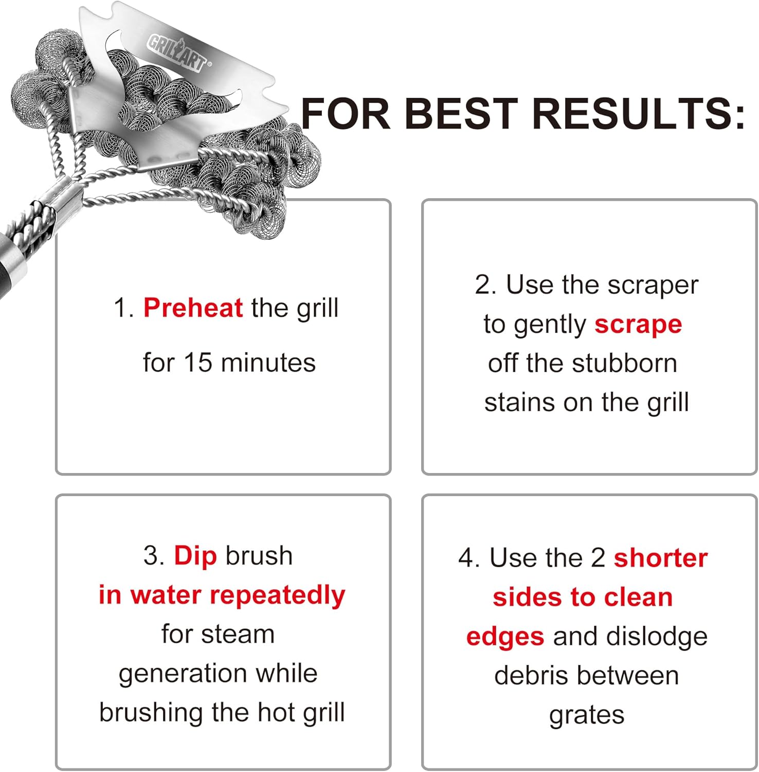 - 【Comfortable to Hold - 18-INCH Ideal Long Handle】: In order to improve your grip comfort and make it easier for you to grip even for a long time, this grill cleaner brush specially does not use a thicker handle. Thicker doesn't necessarily mean stronger, because the right thickness is enough to withstand the cleaning force that most of us are used to. Strong enough and comfortable long handle can not only keep your hands away from heat, but also provide you with maximum comfort. Who wouldn't love it?
