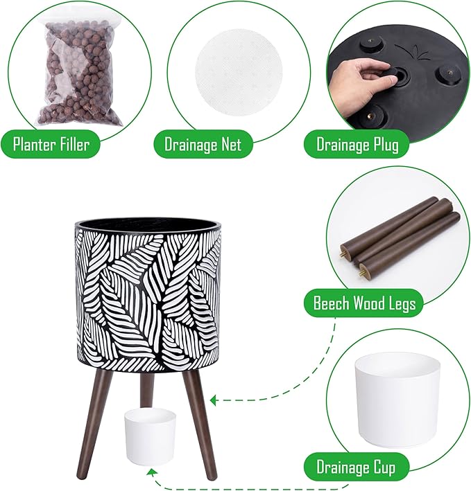 - What’s included: planter pot with drainage hole, drainage plug, set of stand – 3 solid wooden legs.