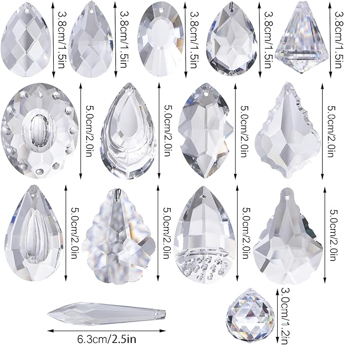 - Material and Contains Content: Material: made of Top Grade K9 Shiny and Flawless Crystals, super sparkly, Clear Crystal Laser Cut, Absolutely gorgeous quality. 15 pcs different shape prism pack with ring clips, Size approx: 1.5-2.5 inch/38 mm-63 mm