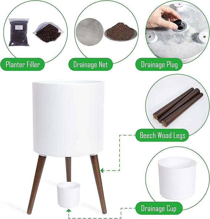 - What’s included: planter pot with drainage hole, set of stand – 3 solid wooden legs.