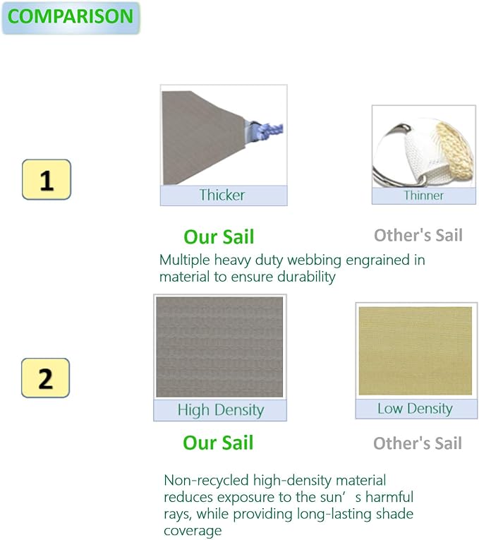 - High Quality Guarantee: Our shade sail made from non-recycled HDPE (high-density polyethylene) 180gsm, industrial cross-weaving for superior support & long-lasting durability. Ready to hoist upon sturdy connections at all four corners. Easy to install, very thick & durably-enforced webbing. Our shade sail includes 304 Stainless Steel D-rings stitched seamlessly into its corners & comes with nylon ropes for convenience, length & width are measured from D-ring to D-ring
