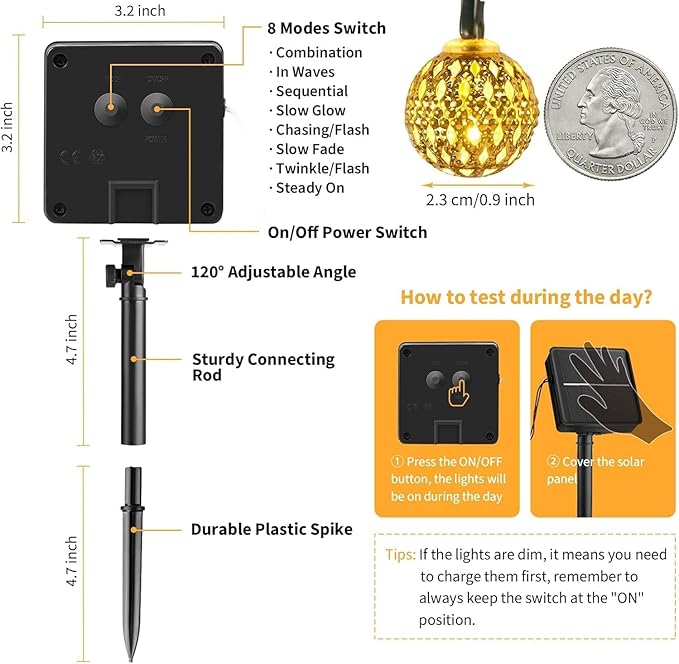 - 【Solar Powered & Auto On/Off】36ft 60 LED string lights, solar energy supply, adjustable monocrystalline silicon solar panel with better conversion rate of energy, no need to replace the battery or extra utility electric cost; Light sensor controls the solar globe lights auto on at dark and auto off at daytime.