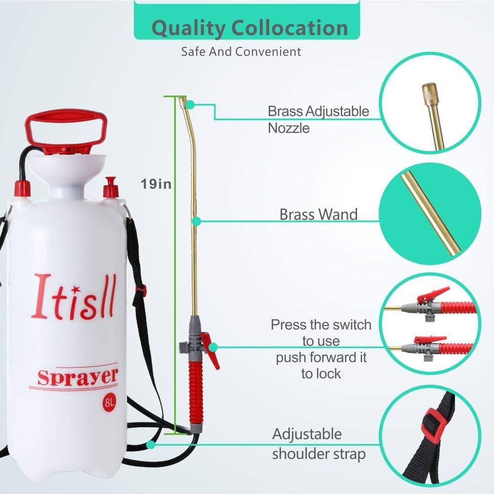 Itisll Portable Garden Pump Sprayer Brass Wand Shoulder Strap for Yard Lawn Weeds Plants 2Gal