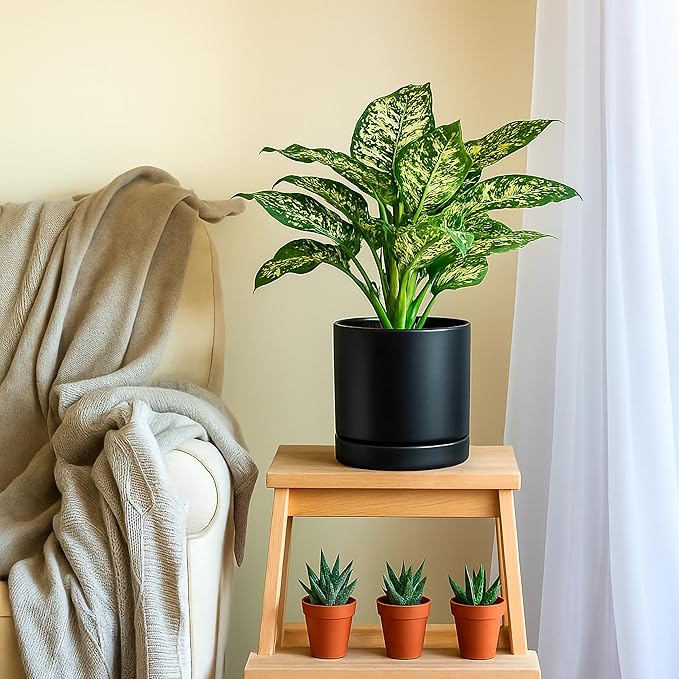 D'vine Dev 8 Inch Ceramic Planter Pot with Drainage Hole and Saucer, Indoor Cylinder Round Planter Pot, Black, 94-O-D-2