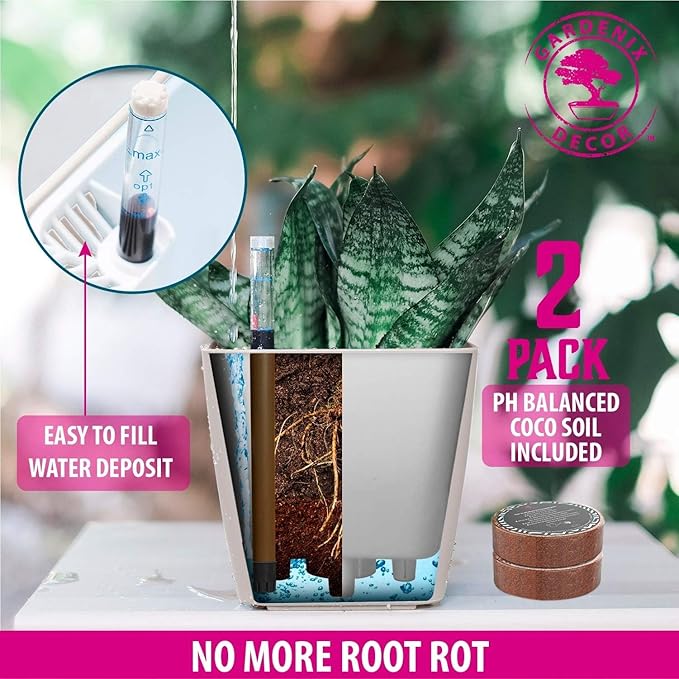 GARDENIX DECOR 5" Self Watering pots for Indoor Plants - Flower Pot with Water Level Indicator for Plants, Grow Tracking Tool - Self Watering Planter Plant Pot – 2 Pack White