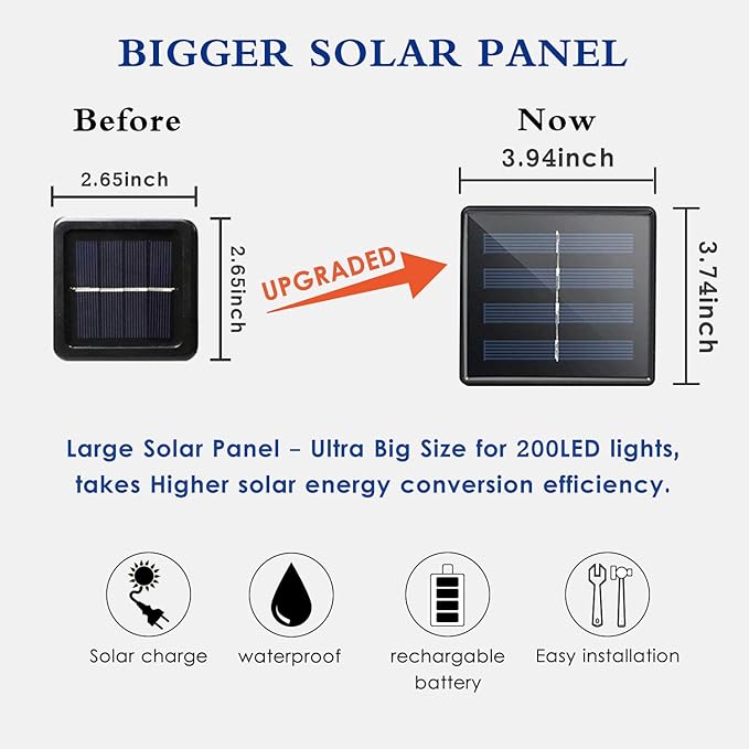 - [Solar Powered & Auto On/Off]: This string lights for outside is solar powered and waterproof, no electricity cost. Larger Christmas solar panel with quick charging technology, bring you higher solar energy conversion, it can work up to 10-12 hours after being fully charged (8 hours). Just place the battery panel in sunny area, it will automatically charge at daytime and light up at night.