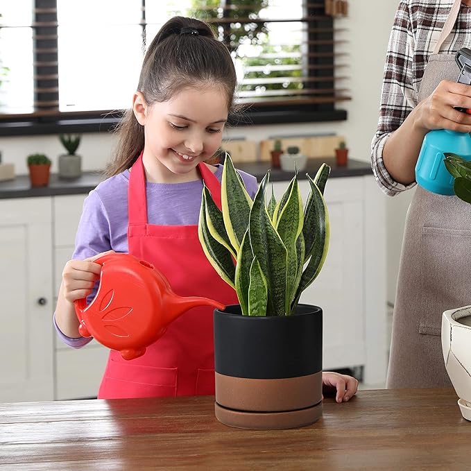 D'vine Dev 6 Inch Ceramic Planter Pot with Drainage Hole and Saucer, Indoor Cylinder Round Planter Pot, Black/Speckled Tan, 94-O-C-7