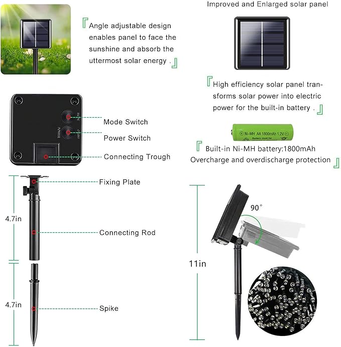 - Built-in 1800MAH Super Larger Capacity Battery and Bigger Size Solar Panel: This solar string lights upgraded battery 1200MAH to 1800MAH, so that have longer working time and more durable.