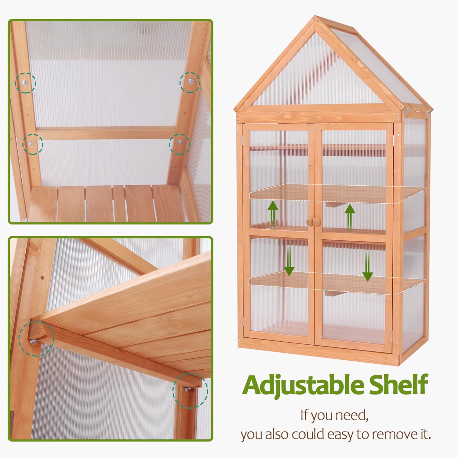 - Adjustable Shelf: The shelf of this mini greenhouse could be freely adjusted height to fit various types of plants, which meets all your needs. (Five screw holes preset, you can also make holes by yourself to determine the height of the shelf)