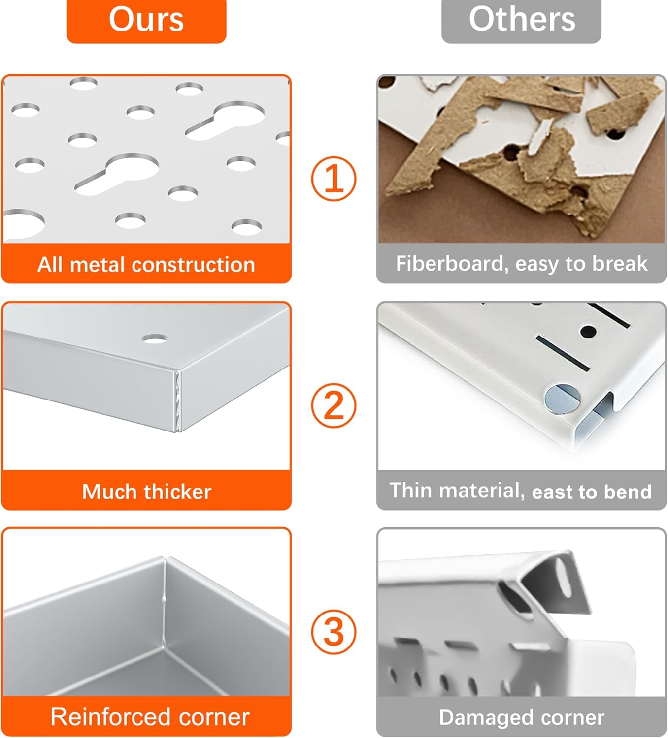 - Most versatile metal pegboard wall organizer storage system. Organizes your garage, workbench, workshop, and keep your tools organized. Pegboard with durable powder-coated finish prevents rust and cracking. The edge folded thickness of the pegboard is 5/8", keeps the pegboard hooks separated from the wall and will not scratch the wall