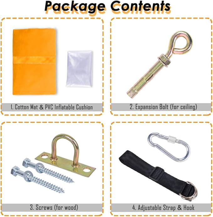 - ★Good Quality of Material – 100% Cotton Mat and Environmentally-friendly PVC Inflatable Cushion. Strong metal screws(for ceiling), hook and adjustable strap.