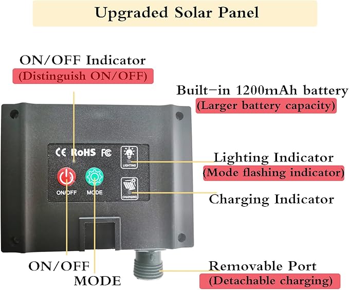 - Detachable Solar Panel: 100% solar power, solar panels and string lights are removable for separate charging.