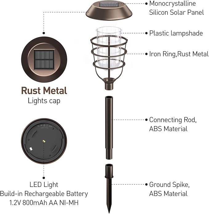 - ☼ RUSTPROOF METAL & DURABLE. The updated solar pathway lights are strong enough to stay outside for a long time. Special designed metal light cap and metal ring which are much better than the plastic made cheaper products.