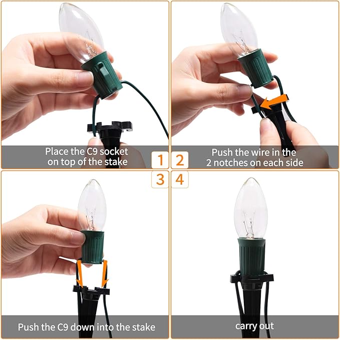 - 20 Clear String Lights: UL listed traditional 25.7 Feet 20 Clear lights strands with 15 inches spacing, 20 Stakes, 3.9 inches anchor spike, E17 holder compatible, plug in and enjoy it. It is also an exquisite gift for friends, families or relatives too
