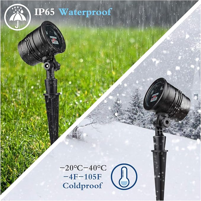 - Laser: Built in professional laser tube, which is much more steady and brighter than traditional outdoor laser lights. Long-distance projection is still stable and clear. 300°adjustable projector head, 120° projection angle, Can project an area of 4000sf from a distance of 35 feet.