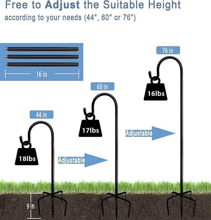 - ♥ Extendable & Tall Hook Hanger: The outside shepherd’s hook hanger made of 3/5 inch width & 2mm thickened steel pipe with 5 solid anchor points, you can free to adjust the suitable height for 76’’, 60 " or 44 ", and also make it stands firmly in the ground without easily falling down, no fear of severe weather such as strong winds, heavy rains, and blizzards, (2 PACK / SET)