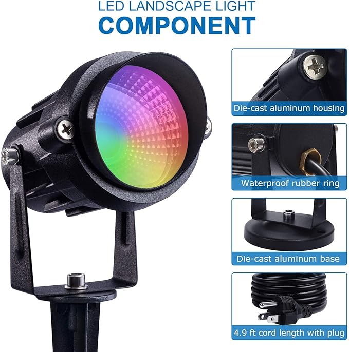 - 【Upgraded IP65 Waterproof Landscape Lights】 Thick aluminum body and glass lens cover design withstand rainy and snowy weather; IP65 waterproof design which greatly improves the stability of outdoor lighting and long-term use.The metal body also acts as a radiator can effectively dissipate heat and prevent the lights from overheating after long use, resulting in a longer lifespan. (Power plug is not waterproof, please keep it from water.)
