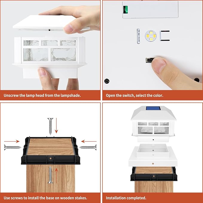 - 【Extensive application scenarios & Weather-resistant】The solar post lights outdoor waterproof IP44 and anti-septic, anti-rust.No worries about rain, snow, frost or sleet. Provide your family a happy time in the garden and beautiful garden party with your friends.Don't Hesitate About Color Selection Anymore. solar post caps lights With dual light sources, you can use the warm light to add a cozy ambiance to your patio, or the bright white light for a modern look.