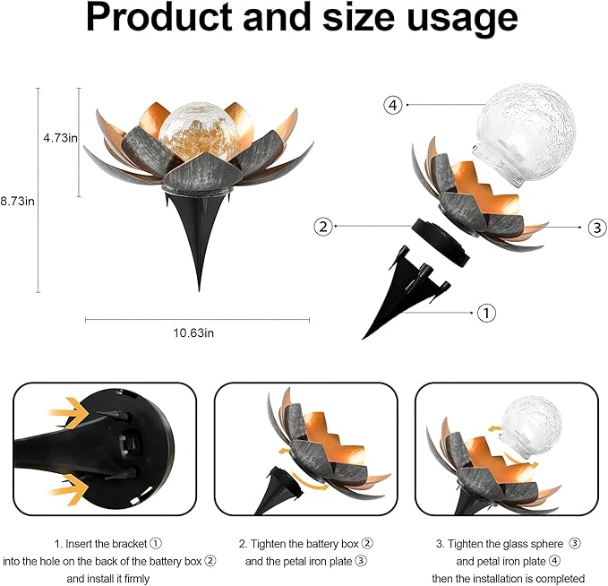 - [Romantic decoration] At night, they emit a warm white glow, bringing a charming decorative effect to your garden at night. The beautiful lotus shape and subtle water ripple patterns are displayed on your terrace in a special way, and the beautiful visual effects create a romantic atmosphere. This is your preferred gift for family and friends