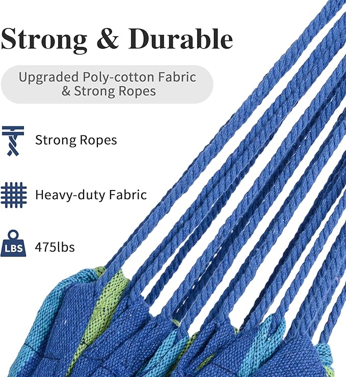 - Upgraded Fabric: Our Brazilian Camping hammock is made of eco-friendly thicker version poly-cotton fabric (no lint, no odor, not pilling, not fading, skin-friendly, and breathable), stronger and much more durable than ordinary fabric hammocks. A comfortable cocoon style hammock can keep you safe while enjoying the peaceful leisure time