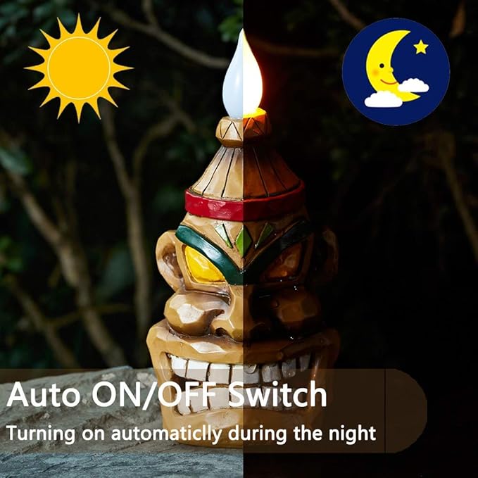 - 【AUTO-ON SOLAR DECORATION】This solar tiki statue is very easy to install and use. Simply turn on the switch and place it under the sunlight and let the solar panel will charge within 5-8 hours during the day and light up automatically at night for 6-8 hours