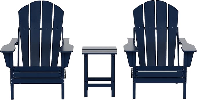 WO Home Furniture Adirondack Chairs Table Set of 3 PCS Outdoor Folding Chairs Side End Table Weather/UV Resistant for Lawn, Garden, Bon Fire, Balcony (Navy Blue)