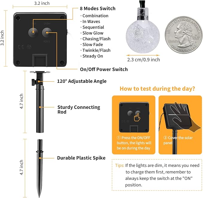 - 【Solar Powered & Auto On/Off】2-Pack total 72ft 120 LED string lights, solar energy supply, adjustable monocrystalline silicon solar panel with better conversion rate of energy, no need to replace the battery or extra utility electric cost; Light sensor controls the solar globe lights auto on at dark and auto off at daytime.