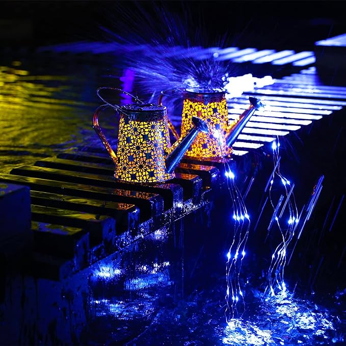 - Suitable for Indoor and Outdoor Use: VOOKRY's solar watering can lights provide 2 modes of use. You can use the included shepherd's hook to hang it in an outdoor garden and let it water your flowers with flowing stars. You can also put outdoor solar lights directly on its own, which is a good decoration for indoor tables, steps, flower POTS or balconies. (Note: Please put the power switch in the "on" position when charging during the day, and place the solar panel in a well-lit place).