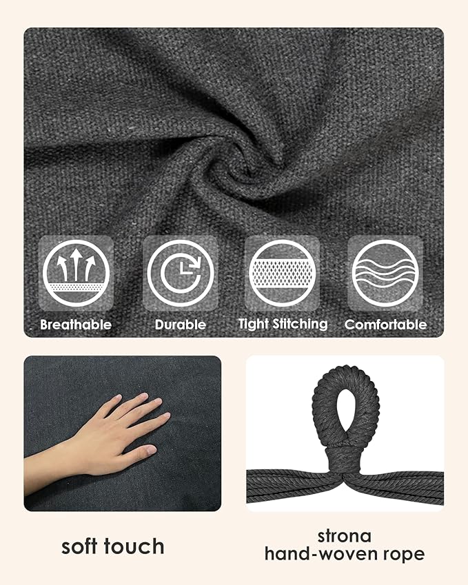 - ▶ Includes 1 Hammock Chair Swing(Grey), 2 Seat Cushions, 1 Vacuum Storage Bag and 1 Carabiner; Hanging hardware is not included.