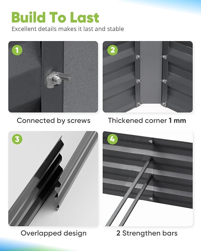- 【Built To Last】Garden raised planting bed is made of powdered coating galvanized steel panel, assure fine condition of the metal garden bed, it's able to stand harsh weather conditions, won't crack in years, use without worry.