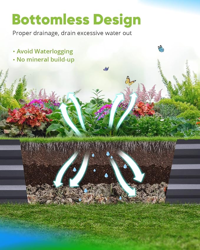 - 【Bottomless Design】Open bottom of metal planter bed is good for drainage, plant roots won't be sick from excessive water. Also plants' roots won't touch the metal sheet, can absorb variant nutrition from the soil, and grow more healthy.