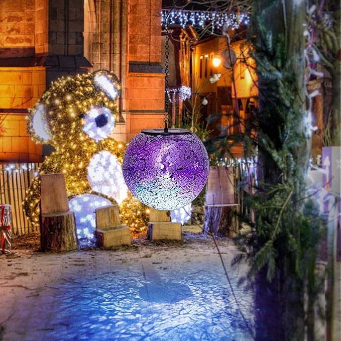 - 【Various Decoration Styles】Solar lights outdoor garden features a glass mosaic construction; Hangs from a sturdy metal chain; Add elegance and color to your backyard, patio, porch, front yard, deck