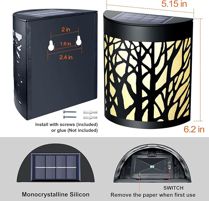 DenicMic Solar Wall Lights Outdoor Wall Sconce Fence Lighting for Patio Front Door Yard Deck Stair Led Forest Decorative Lamps, Waterproof, Warm White/Color Changing (4 Pack)