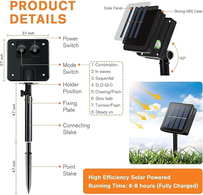 - 8 Impressive Lighting Modes: There are 8 different settings on the back of the solar panel to creates a dreamy feeling and your garden looks like a enchant fairy land at night. Solar fairy lights are an amazing addition to your yard, create a pleasant mood for events, parties or weddings!