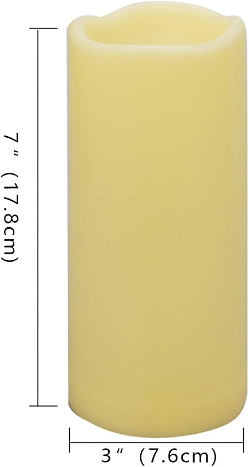 - 【2 PCS Outdoor Waterproof Battery Operated Led Candles】3 inch wide diameter x 7 inch tall, these battery operated dark ivory pillar waterproof candles are ideal for outside patio,front porch with no wax to melt under solar. The outdoor fake electric candle with remote are weatherproof and can be used in glass hurricane lantern candle holder under any weather conditions all year round.