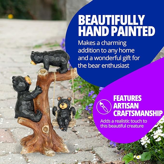 - BEAR FAMILY GARDEN STATUARY: Add cute whimsical decoration and rustic farmhouse style to your home garden decor with this adorable Black Bear Family Tree garden figurine; featuring meticulous artisan craftmanship and lovingly hand painted, this cute garden ornament depicts 2 bears climbing on a tree, and a third bear on a real moving swing, making for a great way to add adorable outside decoration to your garden, yard, lawn, patio, or front porch area