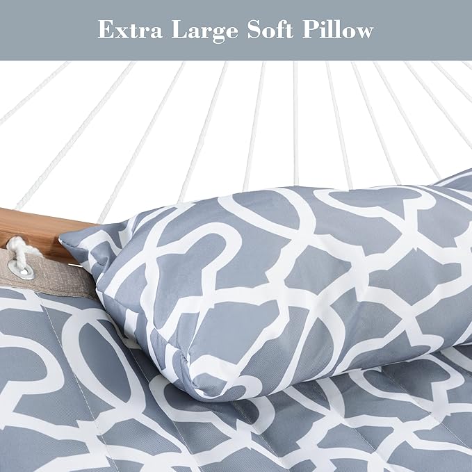 - Comfortable and Non-fading: Two-layer 100% quilted polyester fabric with poly fiber filling, cozier and best for camping and the outdoors. Compared with other quilted hammocks, it will not fade after long-term use. A polyethylene-stuffed head pillow offers superior comfort. You can even set your preferred height by hooking the suitable chain section to the hooks on the stand