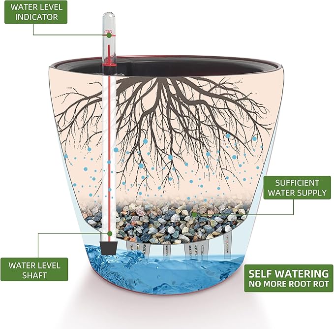 - NEVER MISS WATERING AGAIN - The hydroponic device keeps water ready, then watering time is at your discretion on the gauge. The design of drainage plug and spillway hole is to avoid cycles of overwatering and underwatering, pull out the plug to drain the excess water on rainy days outdoors. The sufficient water supply system enables double the water-efficient than conventional pots. Don't be anxious about missing watering while you enjoy a long term holiday on a journey or travel outside