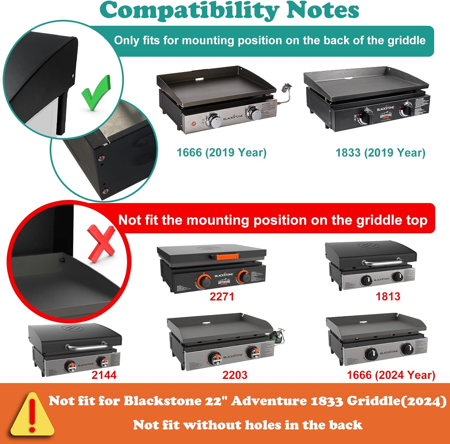 - Package included 5011 Griddle Hard Cover. Compatible with Blackstone 22 inch Table Top Griddle【NOT Fit Adventure 1833(2024 Model) Griddle, Adventure Ready 2271, 2203, 2304,1666AZ,1666 and 1666SA (2024 Model)】Note: Please check if the grill supports back mounting before purchasing.