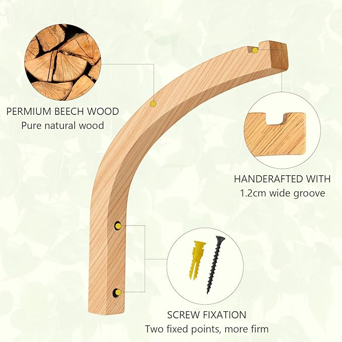 - đżăPremium Beech Wood, Excellent Workmanshipă FGSAEOR wall hook made of an improved version of high-solid wood, nice wood grain, handcrafted with care for long-lasting use. It can hold an up to 11" diameter planter without touching the wall and they come with adequate screws for wall studs and universal anchors for other types of walls that can hold a maximum of 15 lbs.