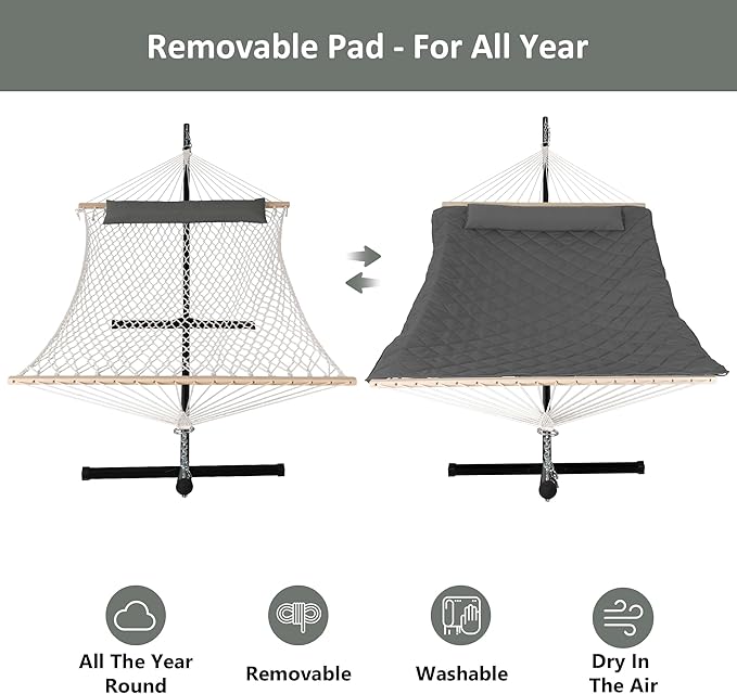 - COMFORTABLE & DURABLE: Double-layered quilted polyester fabric with inner polyester wadding is soft, breathable and long-lasting. Special sewing design increases the beauty and practicality of hammock swing. Extra polyethylene stuffing head pillow offers you superior comfort. Hammock pad is detachable for easy cleaning. It will not fade after long-term use