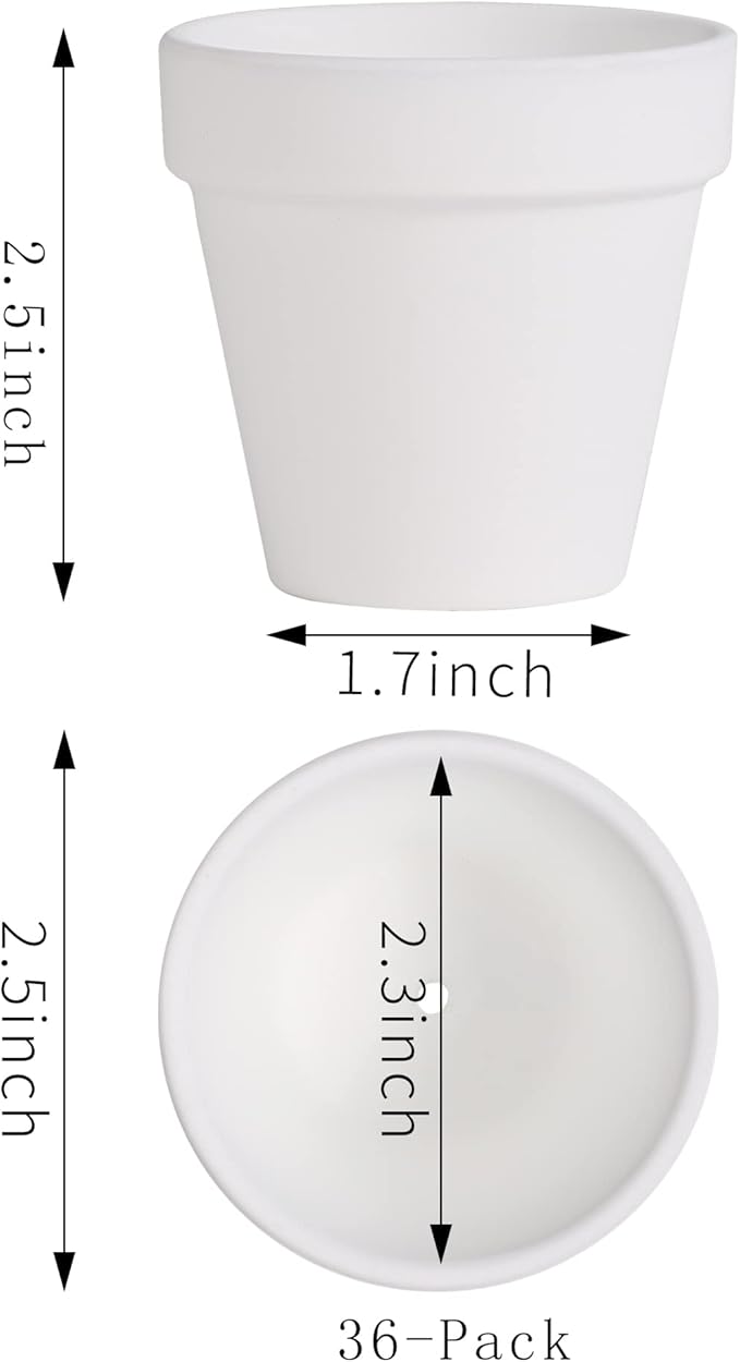 - Packaging of 36 white clay pots: 36 miniature clay pots are made of clay and used for tiny succulents and other small plant species.These small pots don't have a glaze on them, so they can breath like regular colored terra cotta.