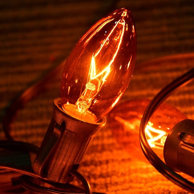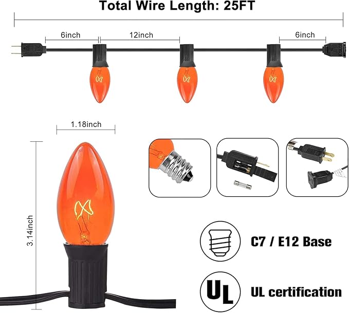 - [Antique Design] 25Ft Halloween string lights with 25 clear orange bulbs, Very clear view of the filament inside the bulbs. Each classic C9 bulb is 7W, 120V and has a rated life of 2500 hours.